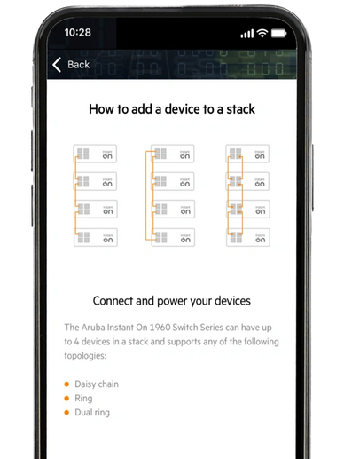 Descubra de forma automática una pila completa de switches e incorpórela fácilmente con flujos de trabajo optimizados dentro de los modos de gestión basada en la nube Instant On